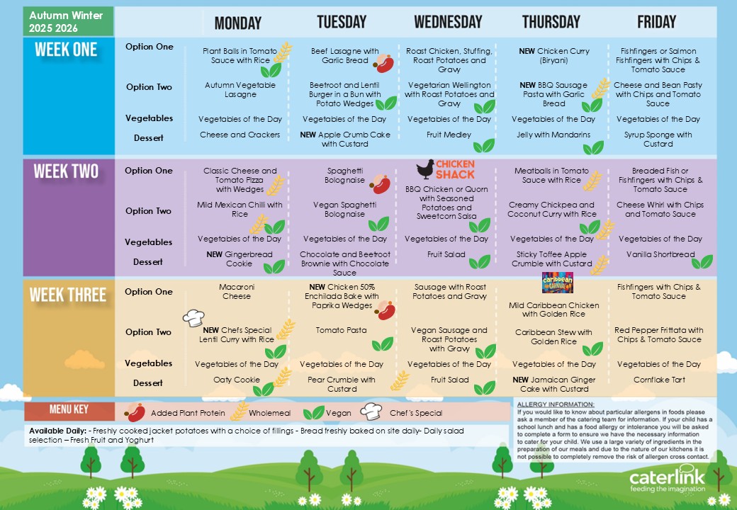 Children have a choice of meals each day – the current menu can be viewed by clicking the link on this page.